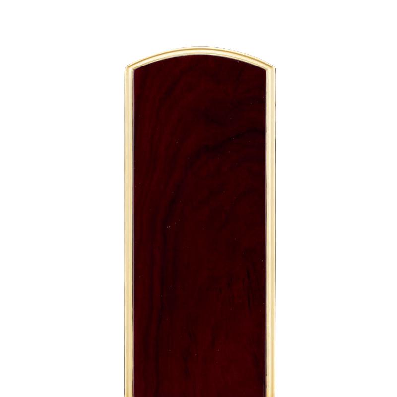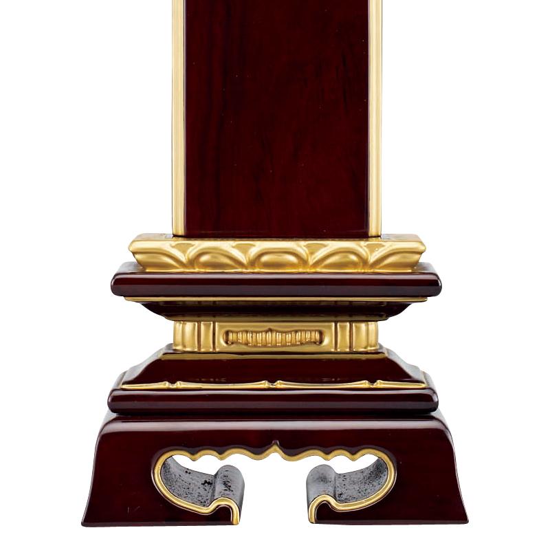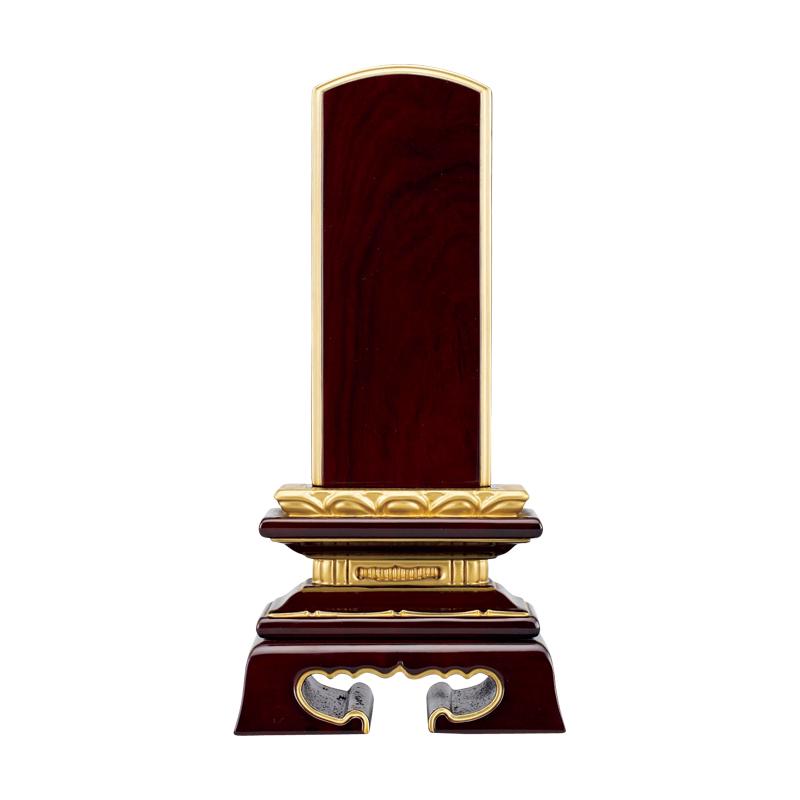 「受花(うけばな)」部分に、蓮の花の飾りをつけた伝統的なデザインです。金箔が施され、上質感のある仕上がりです。カマチ座(足部分)は、「春日型(かすががた)」と呼ばれ、位牌の基本形として広く親しまれています。カラーは、穏やかさと落ち着きを感じさせる「黒檀調」と、深みのあるワインレッドが上品な「紫檀調」の2色です。