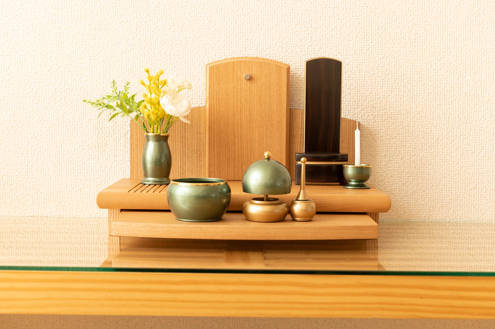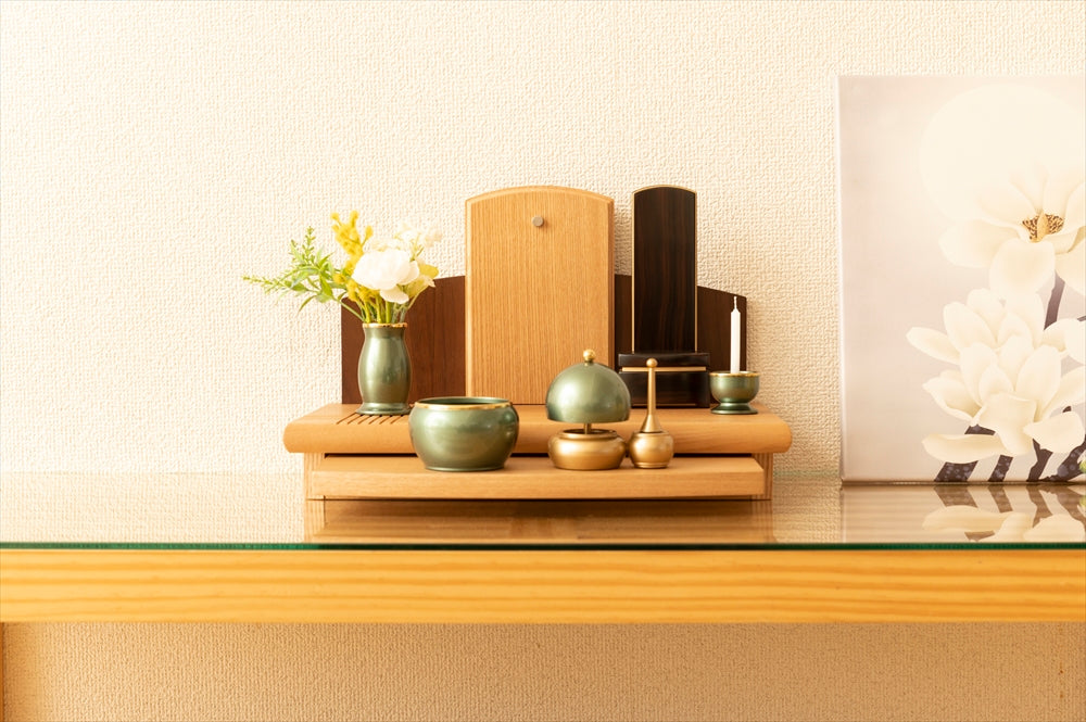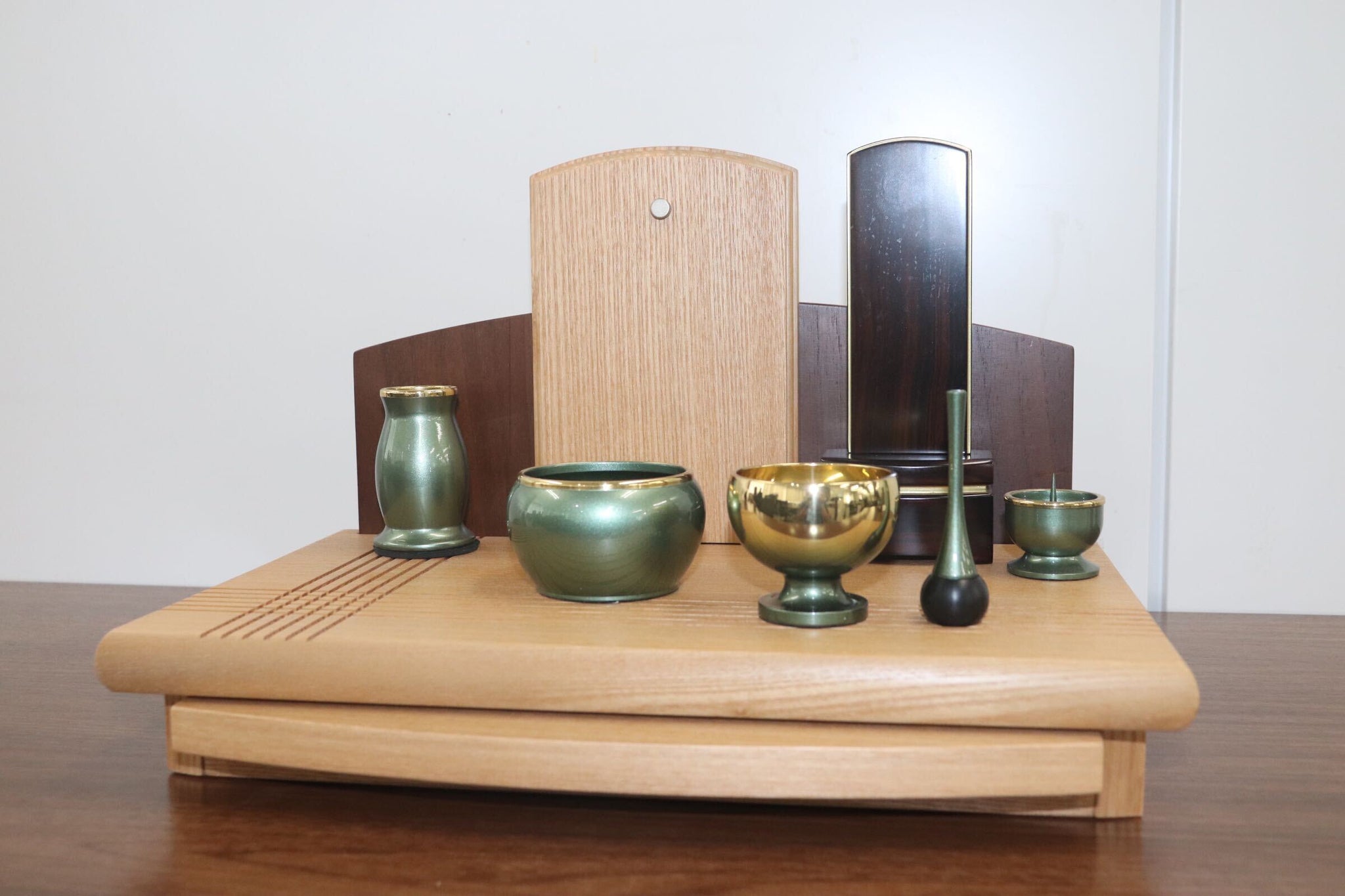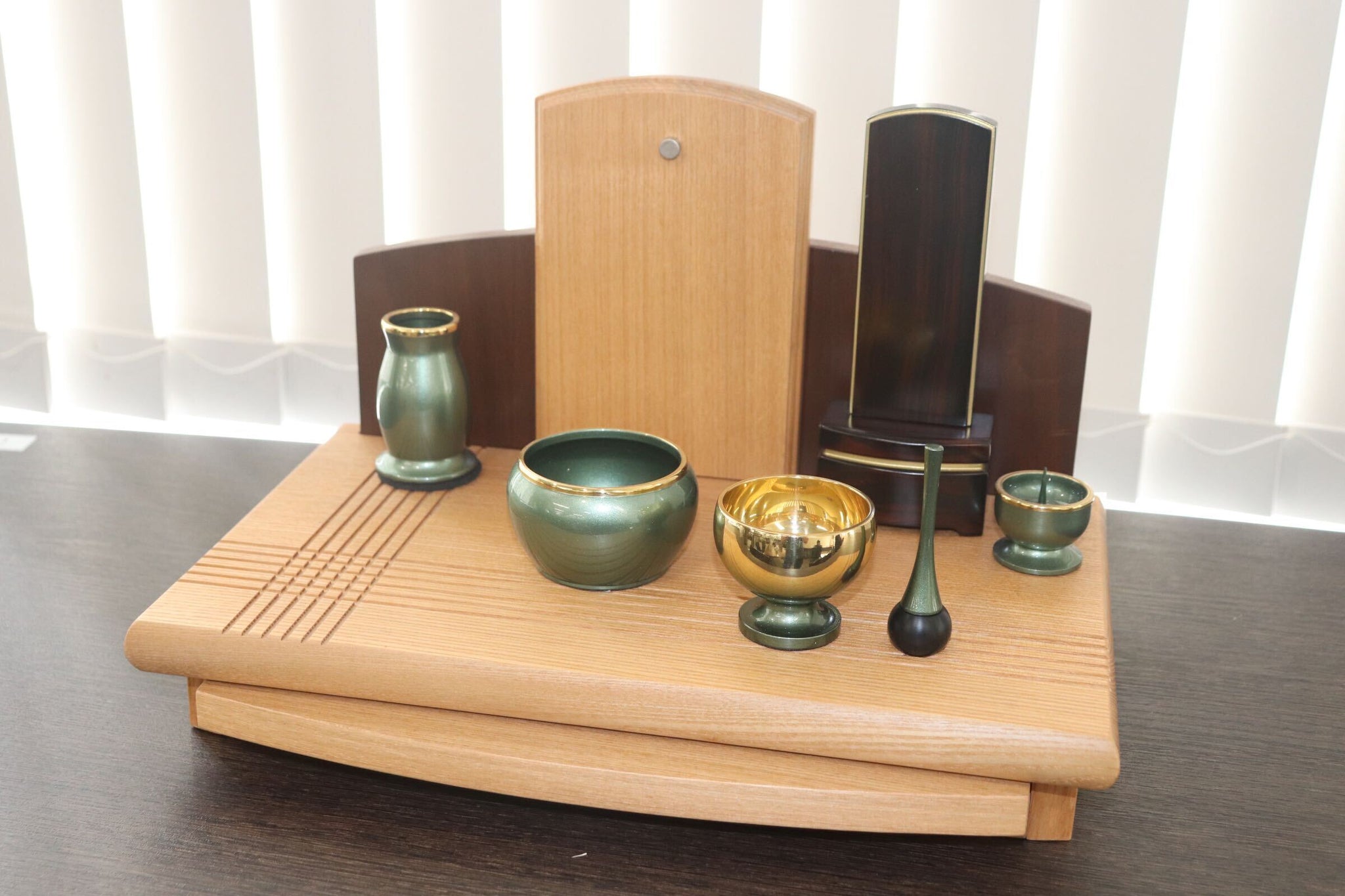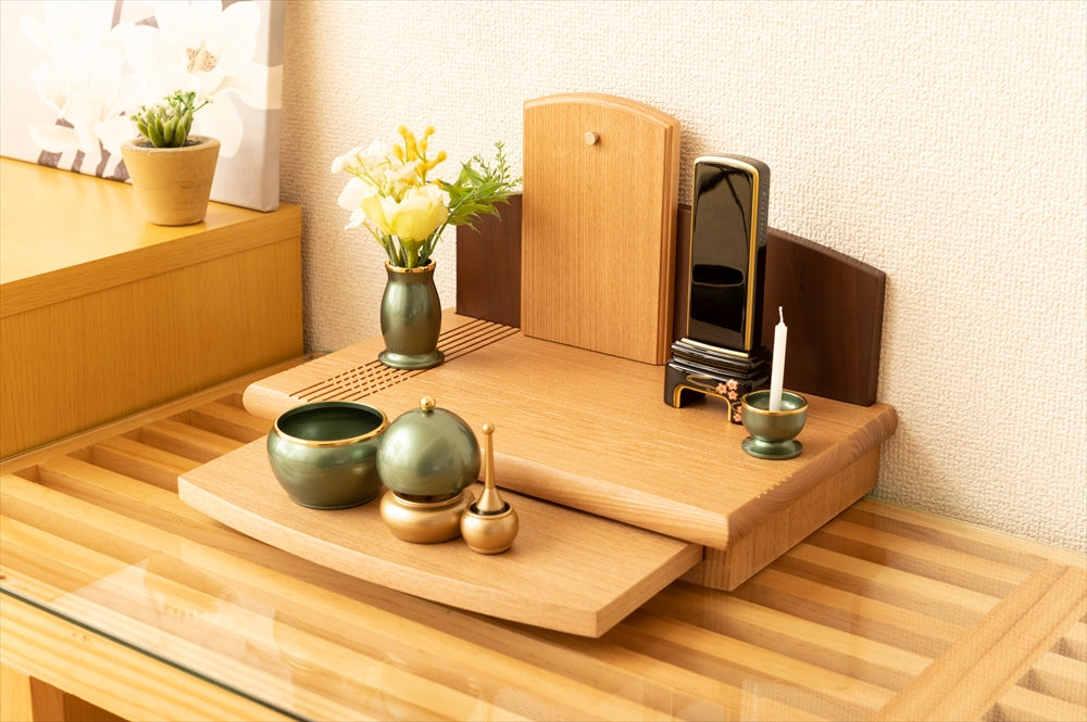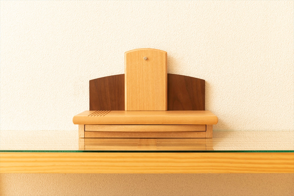 斜めからの写真(カラー:タモ)※仏壇に付属している仏具一式はデザインや内容が異なる場合がございます。