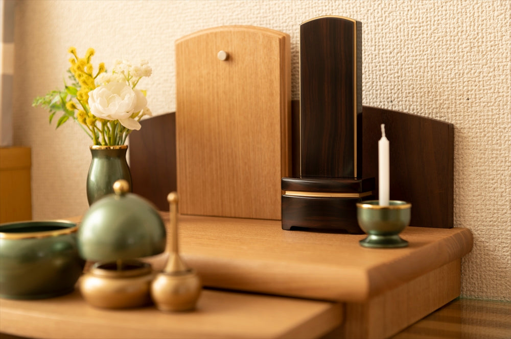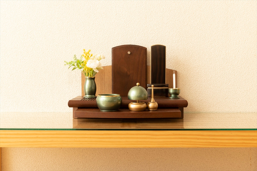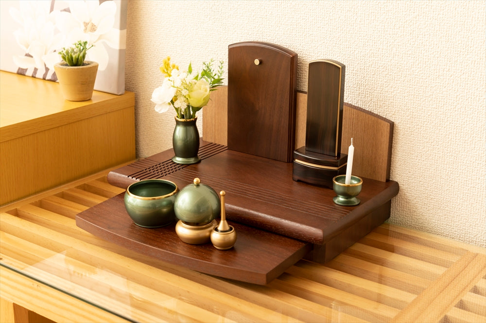 斜めからの写真(カラー:ウォールナット)※仏壇に付属している仏具一式はデザインや内容が異なる場合がございます。